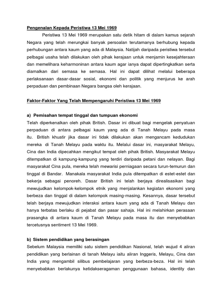 Assignment Peristiwa 13 Mei 1969 - Peristiwa 13 mei pada tahun 1969 ialah rusuhan kaum yang berlaku dan kemuncak masalah perpaduan di malaysia.. Pengenalan peristiwa 13 mei 1969 merupakan satu tragedi berdarah yang banyak meninggalkan kesan terhadap politik, ekonomi dan sosial masyarakat malaysia. Peristiwa 13 mei 1969 merupakan satu tragedi berdarah yang banyak meninggalkan kesan. Semasa pilihan raya 1969, calon pilihan raya terutamanya daripada parti pembangkang, telah membangkitkan soalsoal sensitif cnthnya : It can be concluded that the may 13 incident is an effective mechanism in controlling the conflict in the country. Perbincangan ini bukan untuk melihat ketegangan yang berlaku atau 'melukakan kembali parut yang.