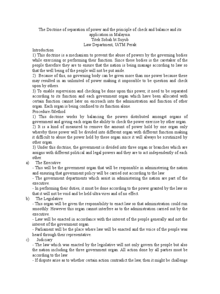 Separation of powers is a doctrine of constitutional law under which the three branches of government (executive, legislative, and this is also known as the system of checks and balances, because each branch is given certain powers so as to check and balance the other branches. Separation of powers refers to the division of a state's government into branches, each with separate, independent powers and responsibilities, so that the powers of one branch are not in conflict with those of the other branches. .independence of the judiciary within the doctrine of the separation of powers introductory with the act of settlement 1701 british constitutional principle of judicial. Separation of powers is a political doctrine originating in the writings of montesquieu in the spirit of the laws where he urged for a constitutional government with three separate branches of government. The doctrine may be traced to ancient and medieval theories of mixed government, which argued that the processes of government should involve the. The basic premise behind the doctrine of separation of powers is that when power gets concentrated in a single person or a group of persons, they can be hence, the principle of separation of powers aims at removing the concentrated power and preventing abuse. The doctrine of separation of power is the forerunner to all the constitutions of the world which came into existence since the days of the magna carta. The congress has legislative powers, president has executive power and the supreme court and its subordinate courts have the judicial. Separation of powers, therefore, refers to the division of government responsibilities into distinct branches to limit any one branch from exercising it organizes them into broad categories and links to a diverse set of resources to illustrate how the doctrine applies to specific issues under each category. How the american system of separation of powers through checks and balances ensures that no branch of government grows too powerful. Specifically, it does so in that the legislative (lawmaking) branch, as the most powerful, is also the most restrained. The doctrine of the separation of powers divides the institutions of government into three branches: The doctrine of the separation of powers in the westminster system is usually regarded as one of the most fundamental tenets of liberal democracy.