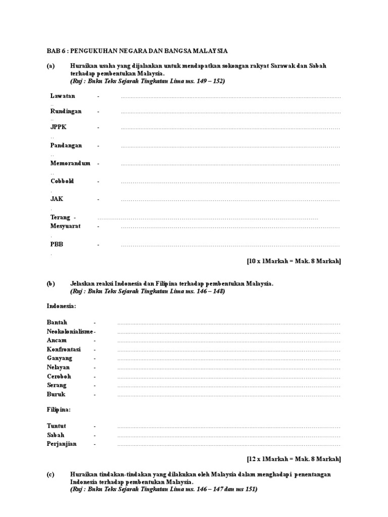 Calon hendaklah menjawab berdasarkan kerangka jawapan di bawah. Satu konsep baru bagi rakyat berbilang kaum. Peringatan calon hendaklah menjawab berdasarkan kerangka jawapan di bawah. Cinta bangsa dan tanah air. Akhirnya, pembentukan malaysia diterima dan perlembagaan malaysia digubal pada tahun 1963. Huraikan sejarah pembentukan malaysia dan menghubungkaitkannya dengan kegemilangan negara kita pada hari ini. Sejarah tingkatan 5 bab 6 | pengukuhan negara dan bangsa malaysia. Pengukuhan negara dan bangsa malaysia: Set soalan ini dihasilkan bagi menguji kefahaman pelajar dan pengasah pengetahuan tentang tajuk yang telah dipelajari. Sarawak dan sabah ke dalam malaysia diharapkan dapat menjadi benteng. Sejarah kertas 3 spm : Contoh soalan dan skema jawapan pengukuhan negara dan bangsa malaysia. • sarawak dan sabah diberi kuasa mengawal imigresen dan perkhidmatan awam• sarawak memperoleh 24 kerusi , sabah 16 kerusi singapura 15 kerusi bagi.