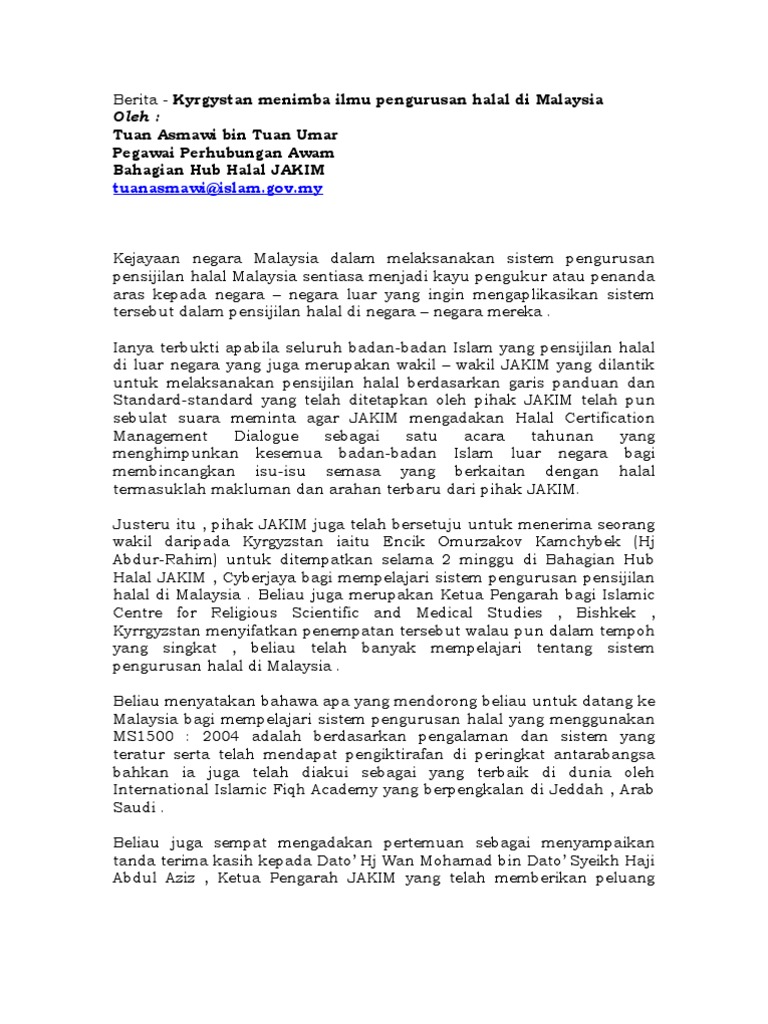 Pdf War 10 Isu Dan Cabaran Pensijilan Halal Satu Kajian Perbandingan Antara Malaysia Dan Thailand from i1.rgstatic.net Pekeliling pensijilan halal malaysia bilangan 1 tahun 2020 : Manual prosedur pensijilan halal malaysia 2014 (semakan ketiga), jakim. As for the halal scene in malaysia, malaysia's halal industry contributed about 7.5% of malaysia's gdp in 2017. Sistem pensijilan halal malaysia memberikan keyakinan kepada perniagaan, pelanggan, pembekal dan pihak berkepentingan lain bahawa produk anda adalah halal dan mematuhi syariah. ▶jom ikuti kupasannya melalui slot fb live sepetang @ halal. Malaysia kini mengetuai cadangan pensijilan halal antarabangsa bagi negara organisasi kerjasama islam oic dan berharap ia dapat dimuktamadkan dalam masa terdekat. Sistem myehalal sila masukkan id pengguna dan katalaluan anda. Berikut adalah draf manual prosedur pensijilan halal malaysia (domestik) dan draf sistem pengurusan halal malaysia pengguna dijemput memberi komen, cadangan dan maklum balas menggunakan borang yang di sediakan sehingga 31 januari sistem pengurusan halal malaysia.